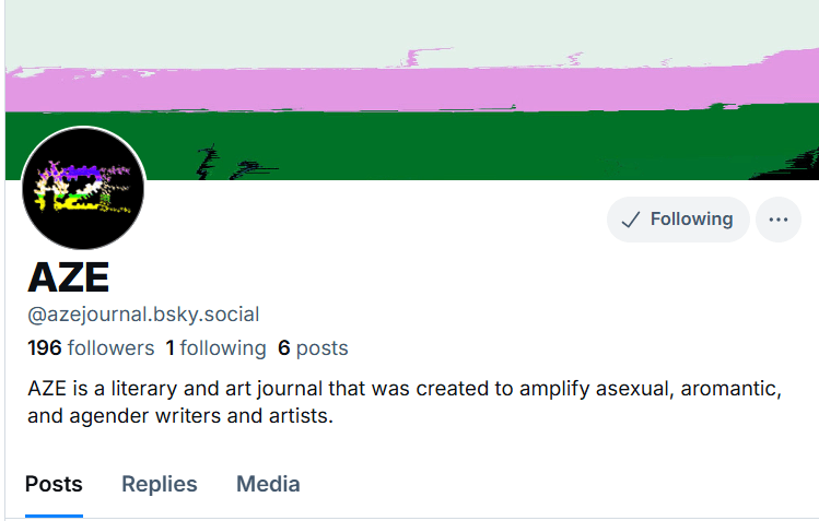 AZE as explained before is a art and literary journal that place an emphasize on asexuality, aromanticism, and agender topics. This journal lets anyone who is anyone of those identities to submit a personal essay, drawing, poetry, videos, or other various forms of media to the online journal. Journal like AZE serve as great way of looking beyond mainstream media to find queer viewpoints and queer voices that need to be heard. Many of the pieces submitted are worthwhile read for anyone who may looking for asexual, aromantic, and agender perspective. If are someone who wants to have their voice you can submit a work of your very own to AZE.
